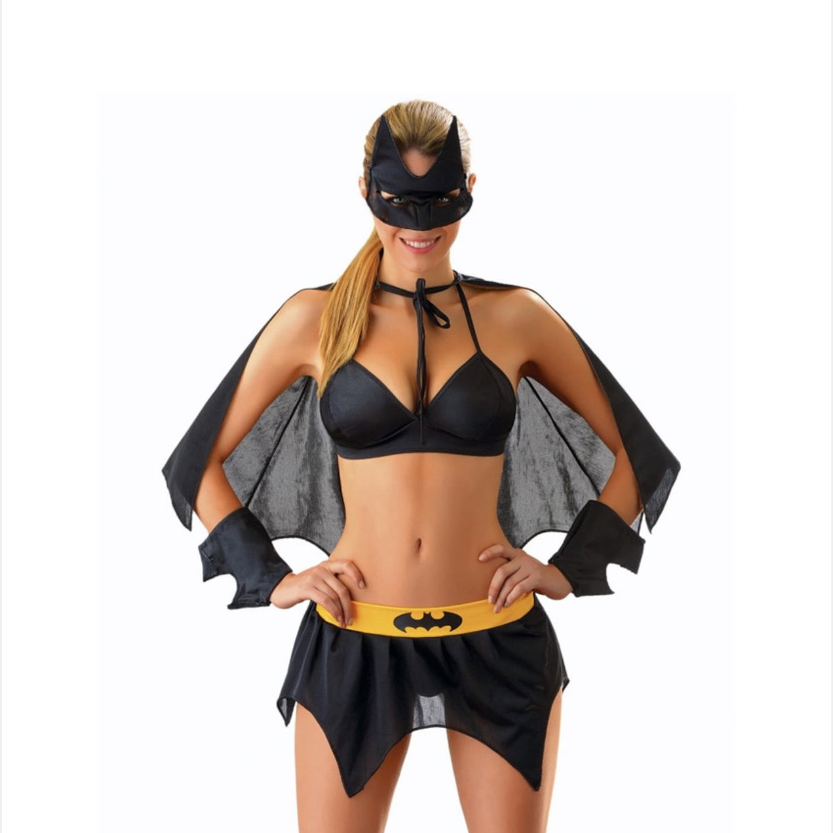 La justicia puede esperar, el deseo no. Esta versión explosiva de Batwoman está diseñada para conquistar la noche con un solo movimiento. El sujetador resalta cada curva, la falda con aberturas insinúa el pecado y la capa añade un aire de misterio que eleva la tensión. La máscara oculta su identidad, pero deja claro su propósito: jugar con el peligro y hacer que cada segundo sea una provocación. Esta vez, la única ley que importa es la del placer absoluto.